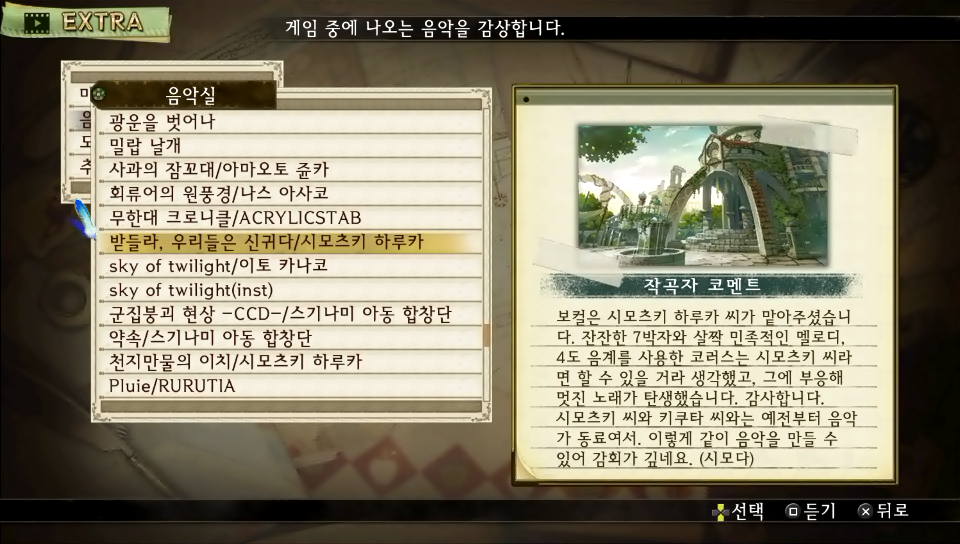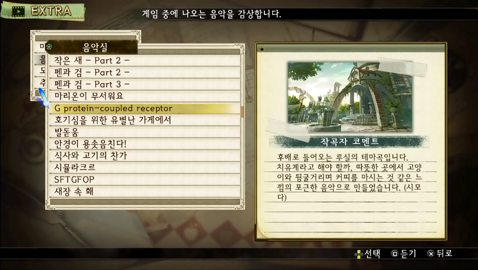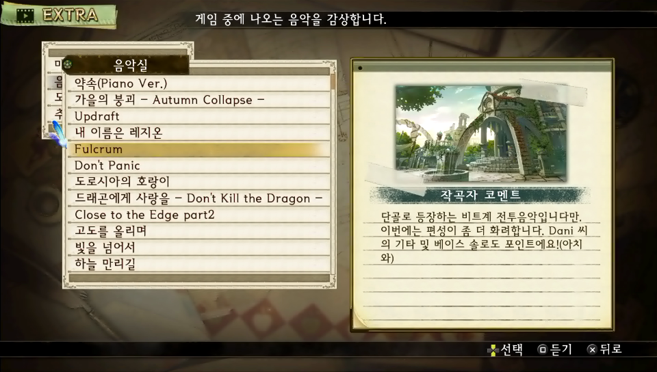 OST는 전투 OST가 인상깊었는데, 10년전에 할 때 조금 지루하게 플레이하다가, 강적과 전투를 하면서 재미가 붙었던 기억이 있기 때문. 그런데 마무리하고 나서 다시 들어보니 자주 들렸던 음악들은 다들 마음을 어느정도 움직였다.